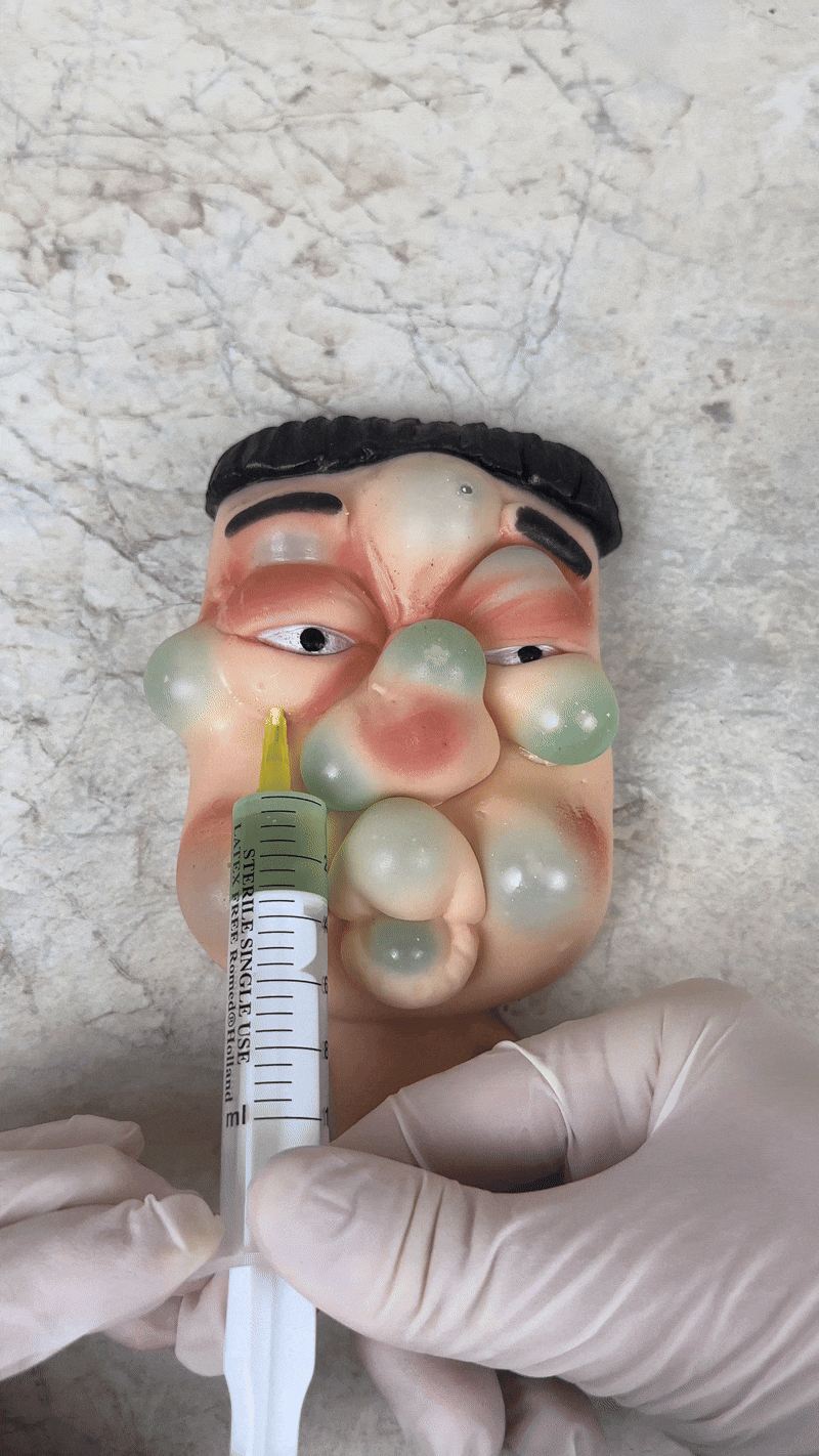 Take the tweezers and poke a small hole in SQUEEZE DADDY™, then take the syringe and inject more fluid into the pimple location.